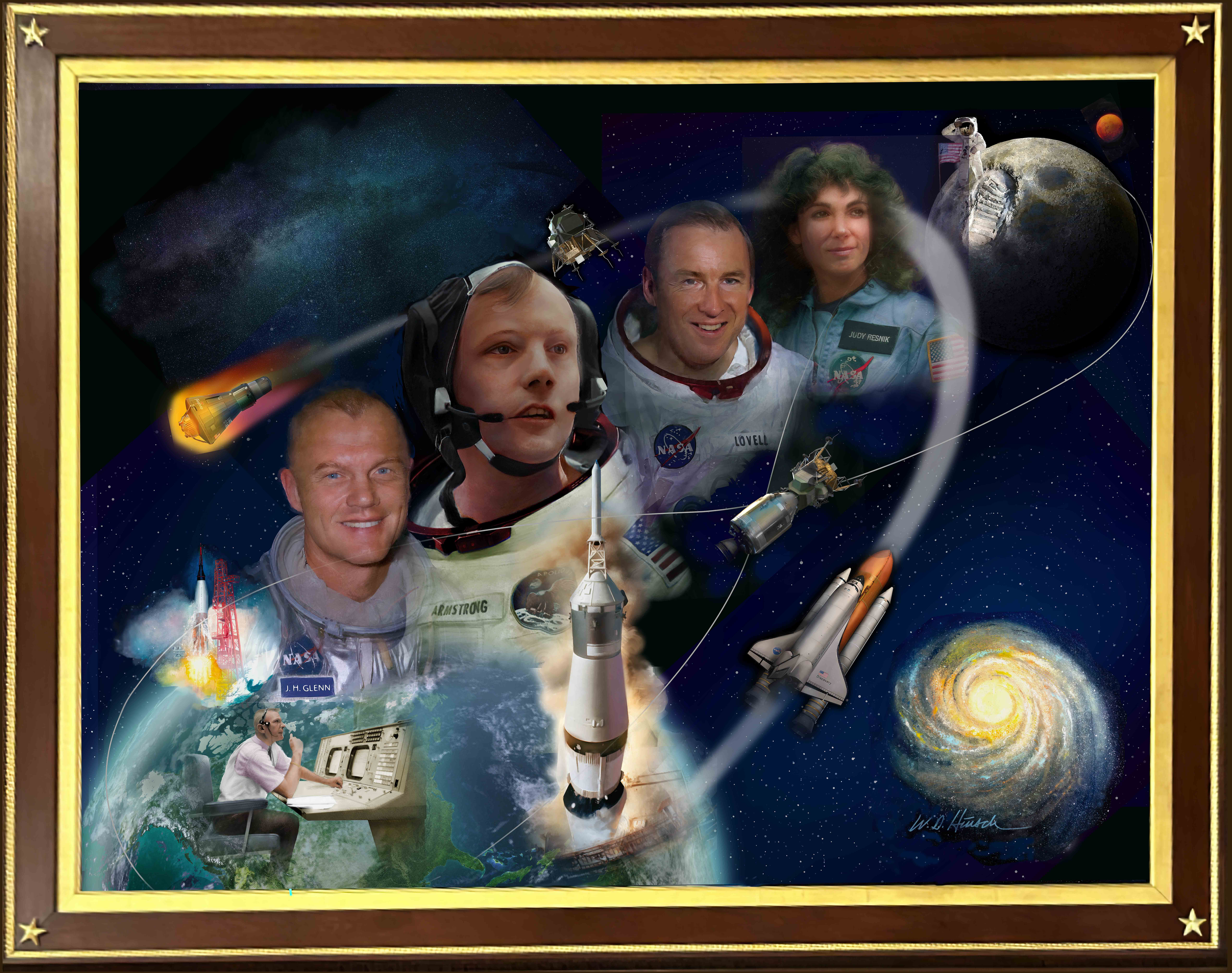 # Honored Figures The painting prominently features **five iconic figures**, each chosen to represent a unique and groundbreaking achievement in the history of American space exploration: - John Glenn The first American to orbit Earth aboard **Friendship 7** in 1962. Glenn, from Cambridge, Ohio, later returned to space at age 77, becoming the oldest person to fly in space. - Neil Armstrong From Wapakoneta, Ohio, Armstrong made history as the **first human to set foot on the Moon** during the Apollo 11 mission in 1969. His words “That’s one small step for [a] man, one giant leap for mankind” became an iconic moment in global history. - Jim Lovell A veteran of **four spaceflights**, Lovell played key roles in two of NASA's most significant missions. As part of **Apollo 8**, he helped execute the first manned orbit of the Moon. On **Apollo 13**, he famously led his crew back to Earth after a critical failure, demonstrating unparalleled courage and leadership under pressure. - Judith “Judy” Resnik A native of Akron, Ohio, Resnik was one of the first women selected by NASA for spaceflight. She flew on **STS-41-D**, the maiden flight of the shuttle *Discovery*, and tragically perished in the **Challenger disaster** of 1986, becoming a symbol of both achievement and sacrifice. - Gene Kranz Though not an astronaut, **Gene Kranz** — a legendary NASA **flight director** from Toledo — is depicted to represent the thousands of scientists, engineers, technicians, and mission controllers who made human spaceflight possible. Kranz is best known for his role during Apollo 13 and his mantra: *“Failure is not an option.”*